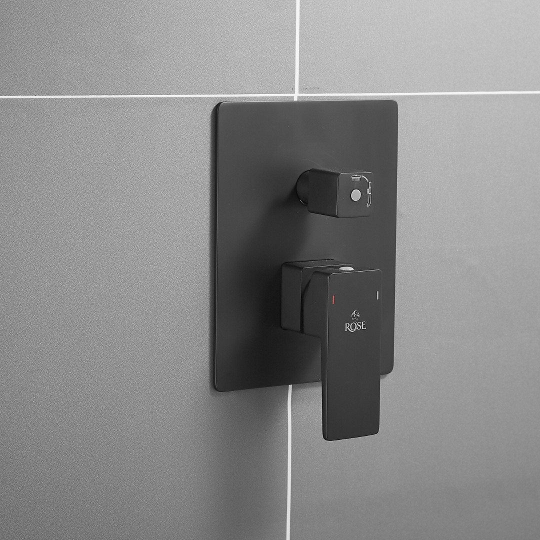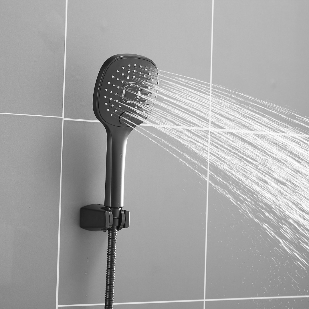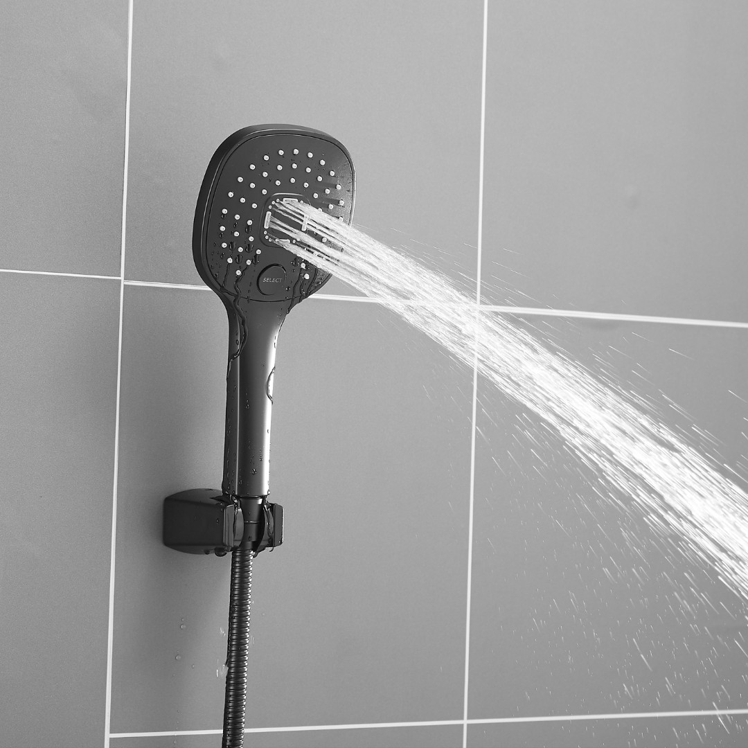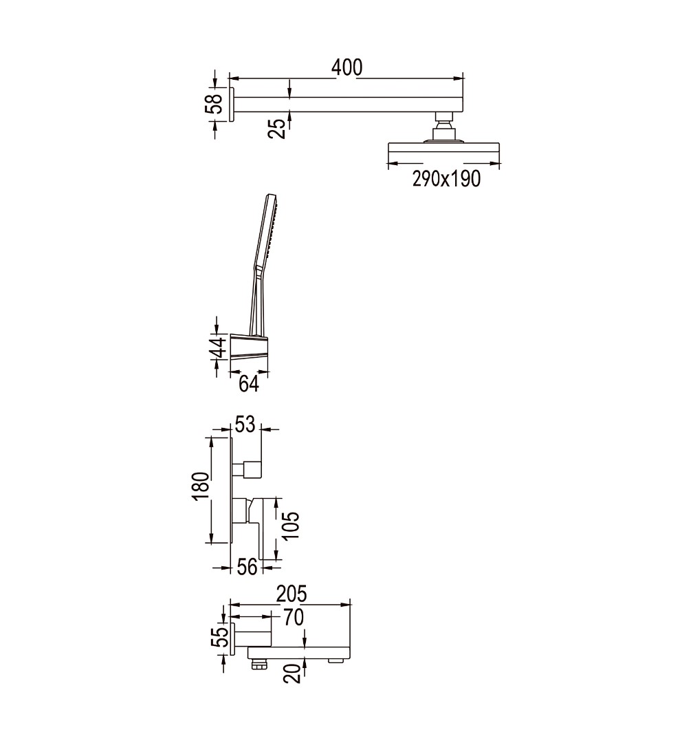 Комплектация: верхний душ, держатель для душевой лейки, душевая лейка, душевой шланг, наружная часть смесителя, смеситель, шланговое подключение.