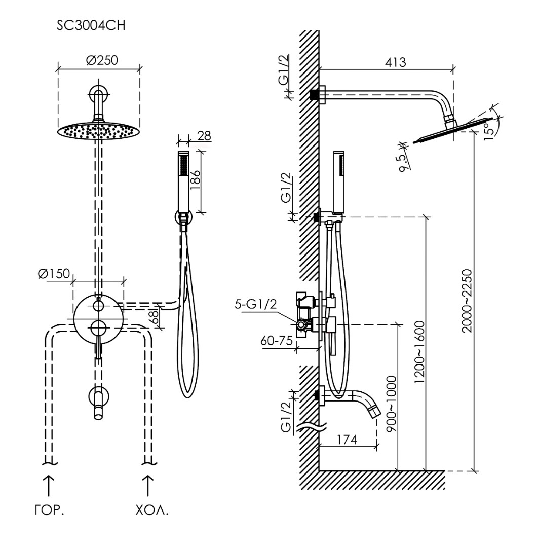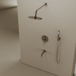 Оснащение: душевой шланг / душевая лейка / держатель для душа / переключатель потоков.