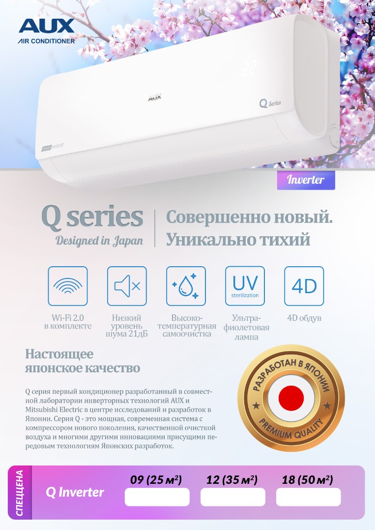 Серия настенных кондиционеров Q Smart Inverter — это новинка 2022 года бытовой линейки инверторных кондиционеров AUX. Модель имеет инновационный УФ-излучатель (UVC), уничтожающий до 99,2% вирусов и бактерий, 4-х этапную высокотемпературную очистку теплообменника внутреннего блока, лёгкий доступ к плате управления для службы сервиса, низкий уровень шума (от 21дБ), улучшенное распределение воздушного потока за счёт новой конструкции вентилятора, а также новый вид пульта и встроенный модуль Wi-Fi. Применение фреона R32 повысило показатели экономичности и эффективности системы в целом.