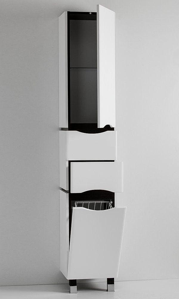 Шкаф-пенал напольный АВН Латтэ 35, правый, с корзиной для белья 41.06. Материал фасада — МДФ, покрытие — высокоглянцевая эмаль. Материал корпуса — ЛДСП цвета венге/ЛДСП, покрытое высокоглянцевой эмалью. Дверцы и ящики оснащены системой плавного закрывания.