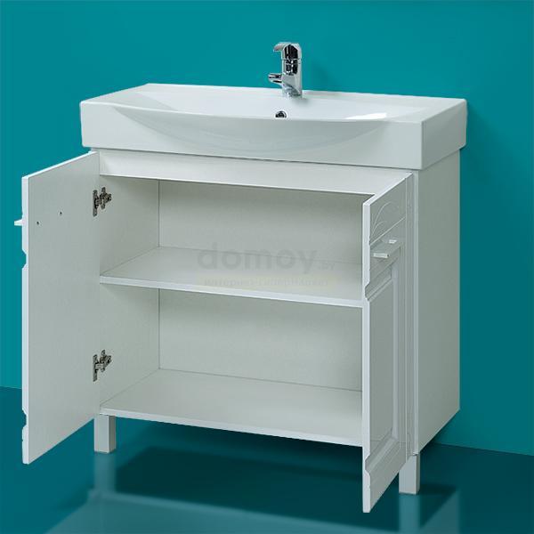Тумба для умывальника Акваль Лорен 85 с двумя распашными дверями и несъемной полкой внутри. Цвет на мониторе может отличаться от оригинала.