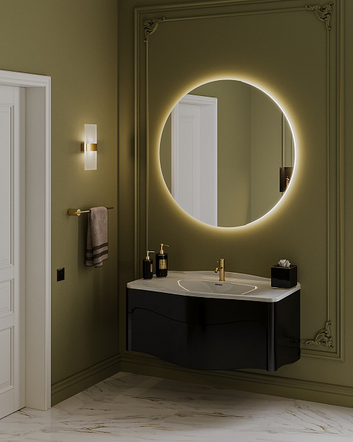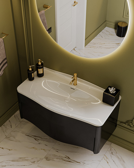 Гнутые фасады тумбы повторяют изгибы раковины Анжело.