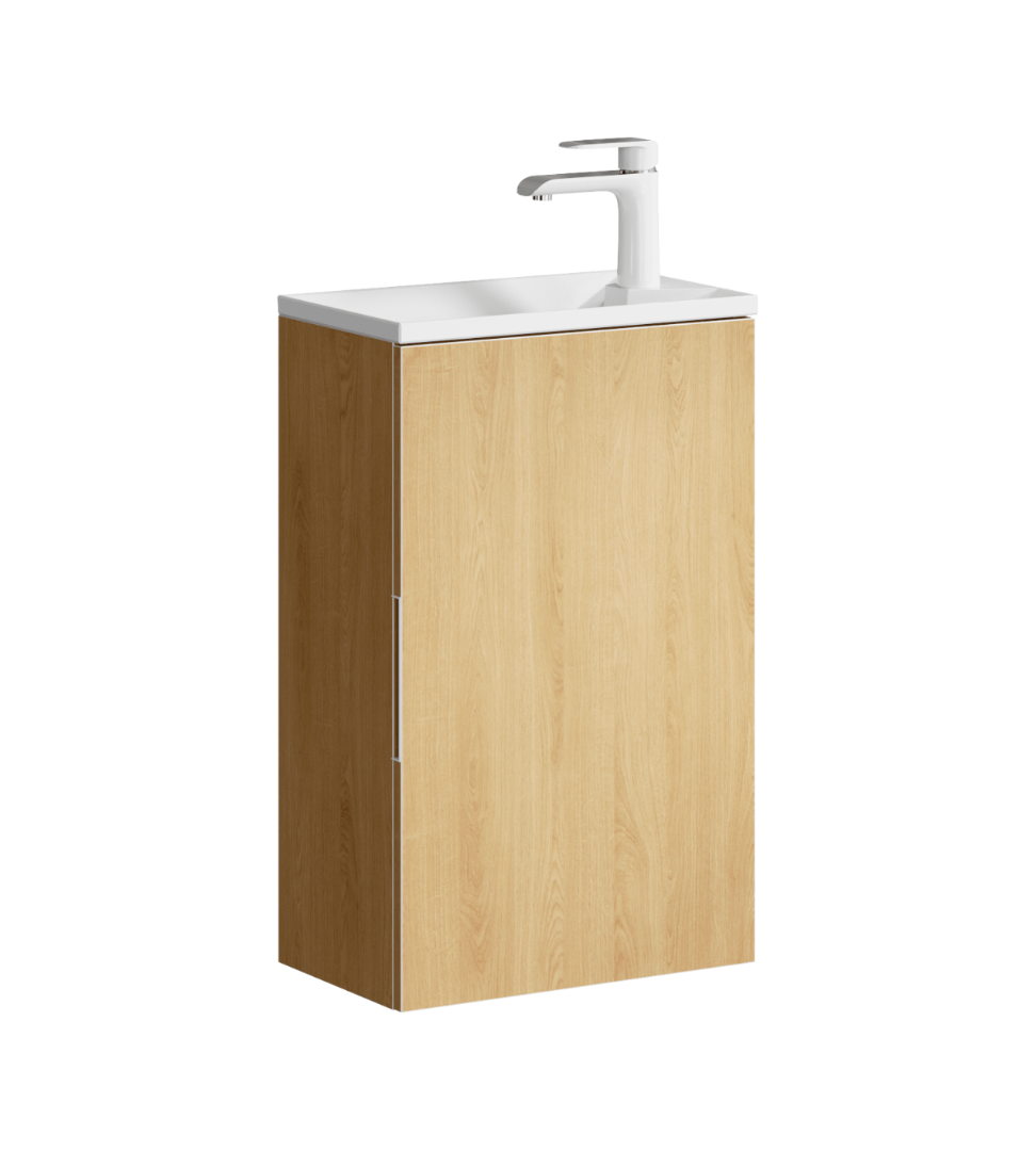 Подвесная тумба с одной универсальной левой/правой дверью в цвете дуб золотой с умывальником из литьевого мрамора. Материал корпуса и фасада - ЛДСП, покрытие - ламинат.