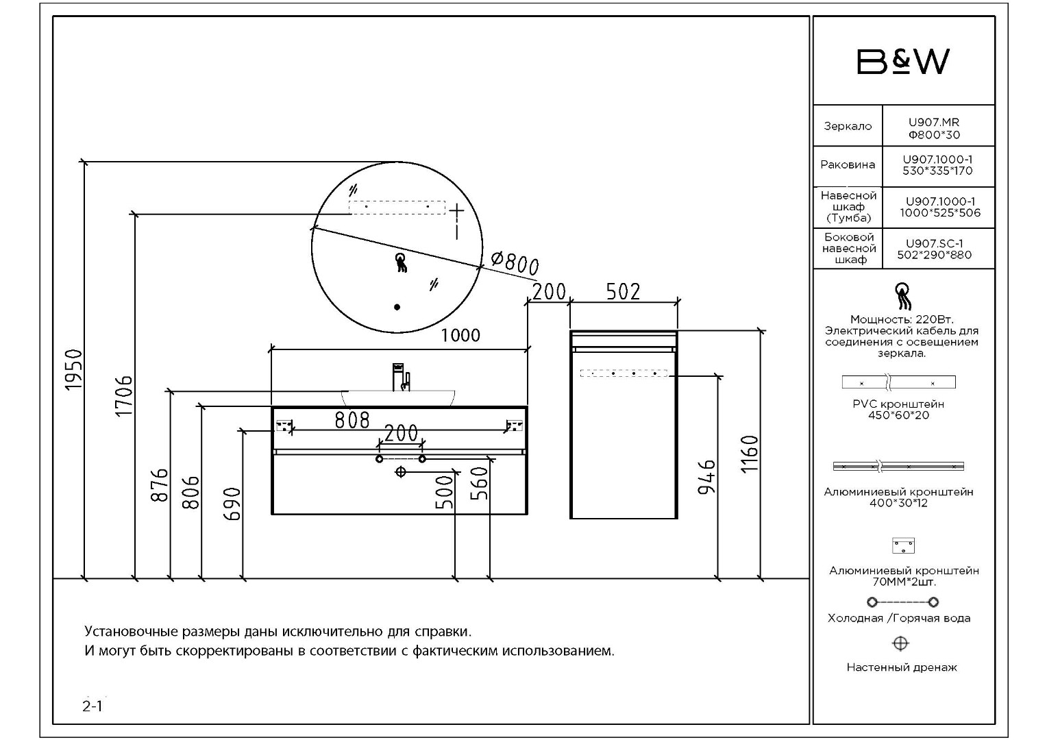 Тумба подвесная Black&White Universe U907-1.1000 BNL, с раковиной и зеркалом
