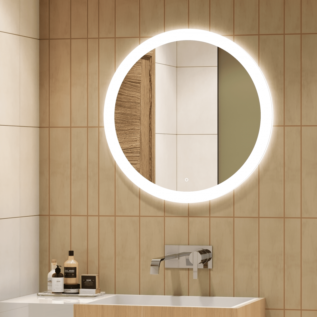 Стильное круглое зеркало Rinaldi. Светодиодная подсветка и сенсорный выключатель входят в стандартную комплектацию. Зеркало с подсветкой обеспечит хорошую видимость отражения в зеркале, при которой будет снижаться напряжение глаз. Сенсорный выключатель с диммером позволяется легко включать и регулировать яркость подсветки. За дополнительную плату можно установить часы, подогрев стекла, увеличтельное стекло, многофункциональную панель.