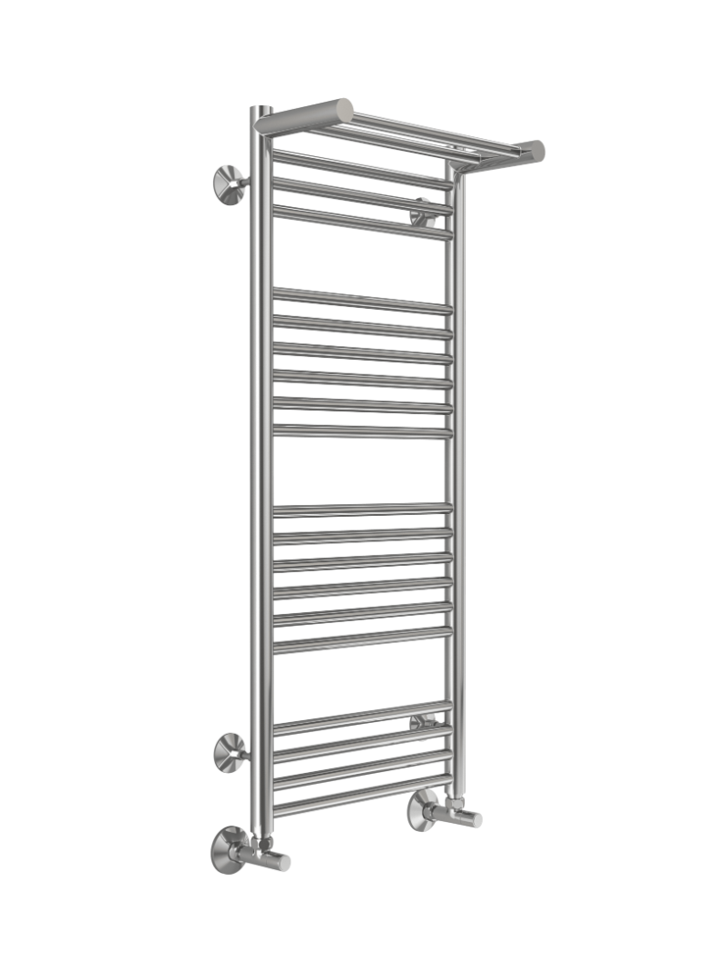 Модель «Аврора» с полкой – это грациозность линий и строгость форм. Она прекрасно дополнит дизайн интерьера в классическом стиле, отвечая за уют и тепло в ванной комнате. Дизайн-радиатор выполнен из нержавеющего металла с покрытием из никель-хрома, благодаря чему предотвращается ржавление и разрушение труб и рёбер под воздействием влаги и агрессивной среды.