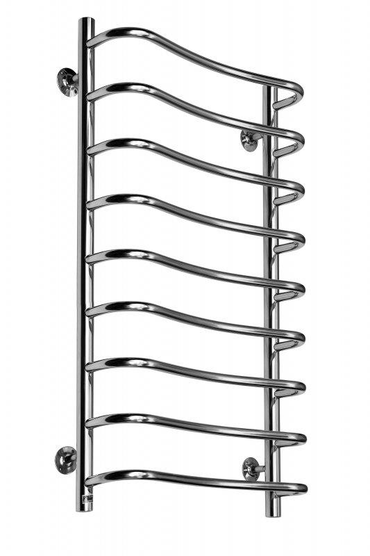 Полотенцесушитель водяной Ростела Чайка 50x100/9 (нижн.подв., 1/2" резьба) имеет тепловую мощность 504 Вт. Покрытие полированное (блестящее). Количество перекладин - 9. Диаметр перекладин - 1.8 см. Тип перекладин - скоба.