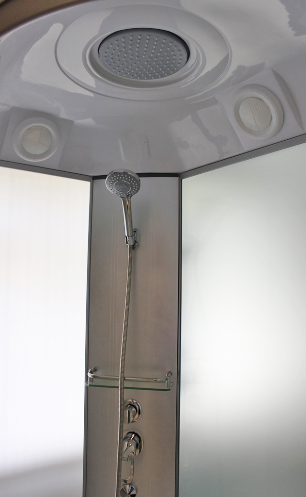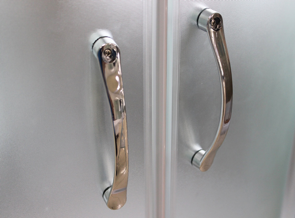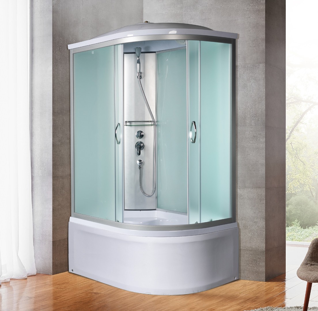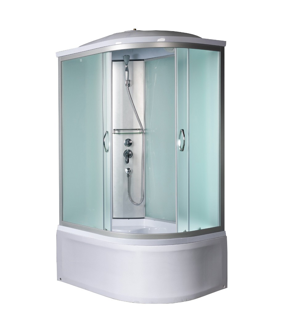 Полукруглая асимметричная душевая кабина для пристенного монтажа в левый угол. Закалённое травмобезопасное стекло 4 мм.