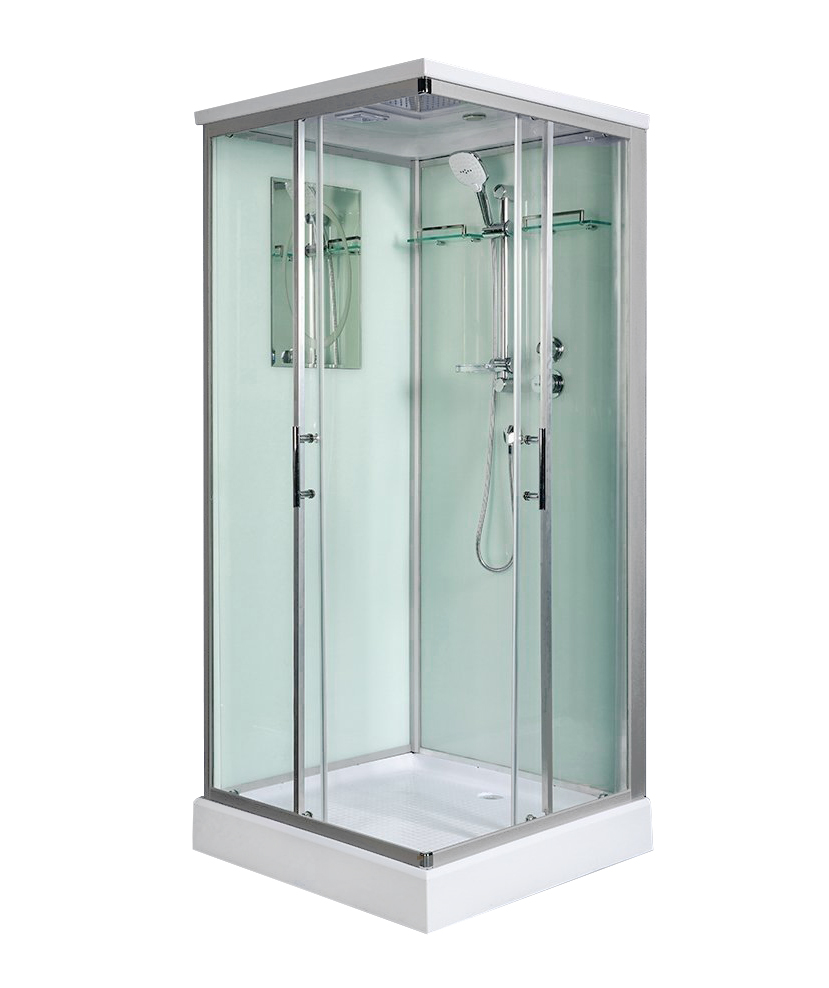 Передние и боковые стенки кабины выполнены из надёжного и прочного закалённого стекла толщиной 5 мм. Ему не страшны перепады температур, случайные удары. Задняя стенка изготавливается из идентичного стекла, но окрашивается в белую цветовую гамму.