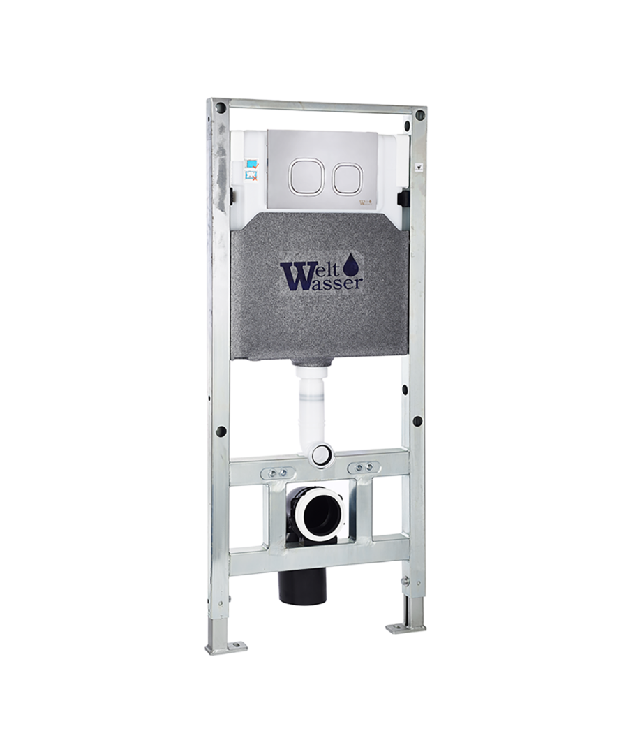 Система инсталляции для подвесного унитаза от компании WeltWasser порадует своей функциональностью и надёжностью. Монтаж конструкции осуществляется в капитальную стену и пол. Усиленная рама выполнена из нержавеющей стали с помощью бесшовной внутренней сварки. Для долговечности и более надёжного крепления посередине рамы идёт дополнительный крепёж. Усиленные регулируемые ножки возможно установить в 4х вариантах. Инсталляция для унитаза отличается своей бесшумной работой, т.к. имеет пластиковый бачок слива в пенопласте и двойную шумоизоляцию по всей длине бачка и трубы. Подвод воды осуществляется сверху и сзади конструкции.