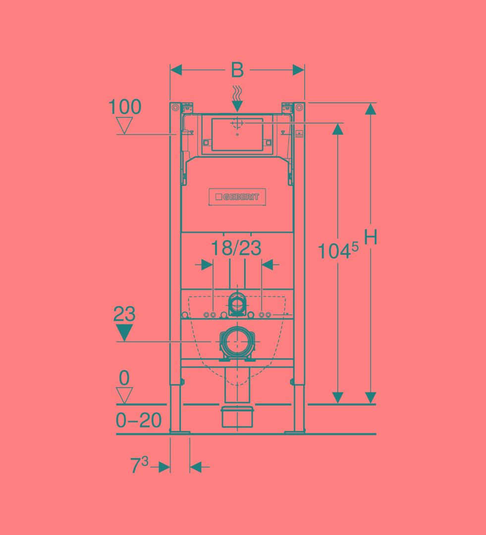 Бачок скрытого монтажа, полностью герметизированный от попадания конденсата. Самонесущая конструкция. Рама с отверстиями d9 мм для крепления в деревянном каркасе. Ножки оцинкованные, с бесступенчатой регулировкой 0 - 20 см. Регулируемый объём смыва. Объём смыва большой, диапазон регулировки: 4 / 4,5 / 6 / 7,5 л. Объём смыва малый, диапазон регулировки: 2–4 л. Подключение к водопроводу сзади или сверху в центре.