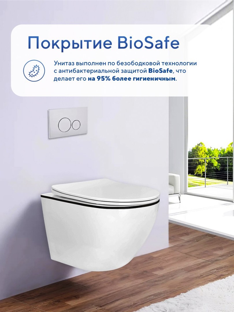 - Покрытие BioSafe. Унитаз выполнен по безободковой технологии с антибактериальной защитой BioSafe, что делает его на 95% более гигиеничным;