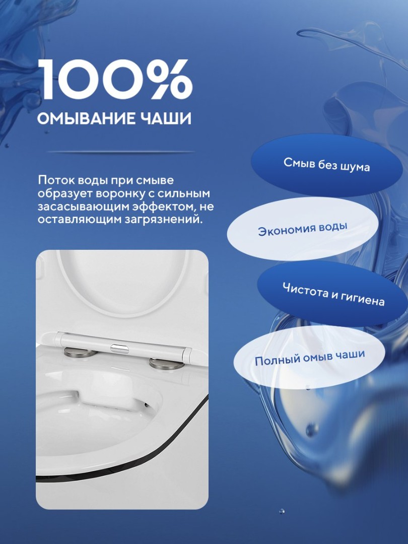 - Поток воды при смыве образует воронку с сильным засасывающим эффектом, не оставляющим загрязнений;