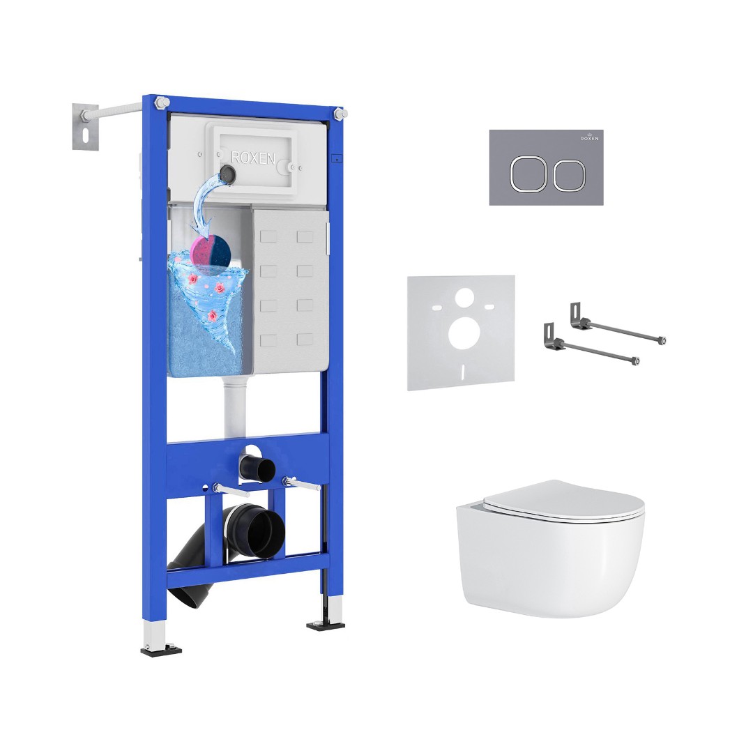 Комплект инсталляции 6 в 1 Roxen StounFix Dual Fresh 966439 с унитазом Vortex 530160-01 и клавишей смыва Santi 410280DG с аромадозатором.