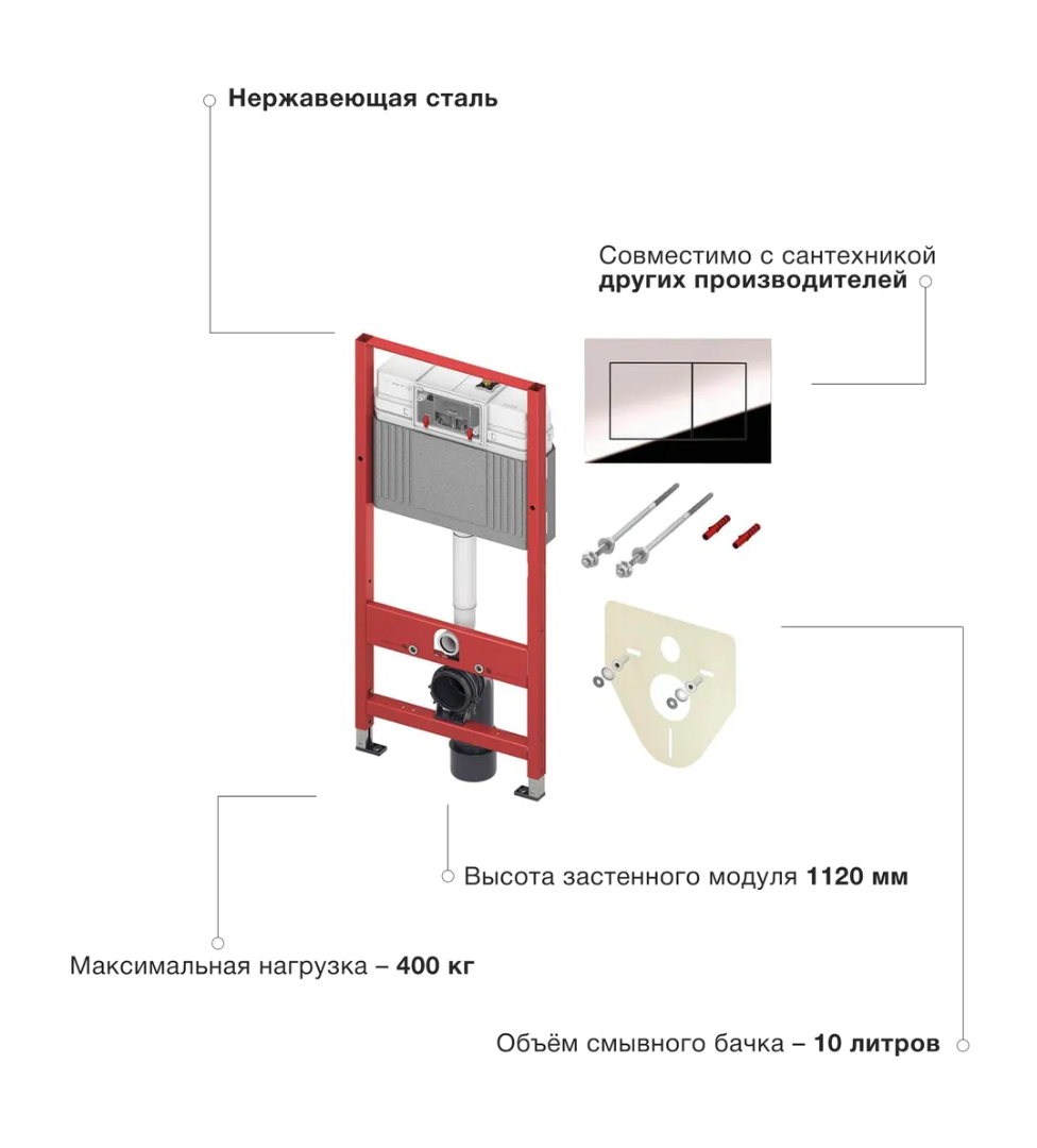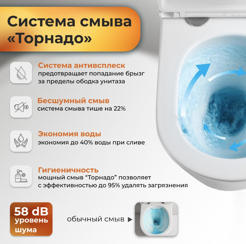 - Смывной бачок объёмом 10 л, выборочный слив большого (4,5/6/7,5/9 л) или малого (3 л) объёма воды.
