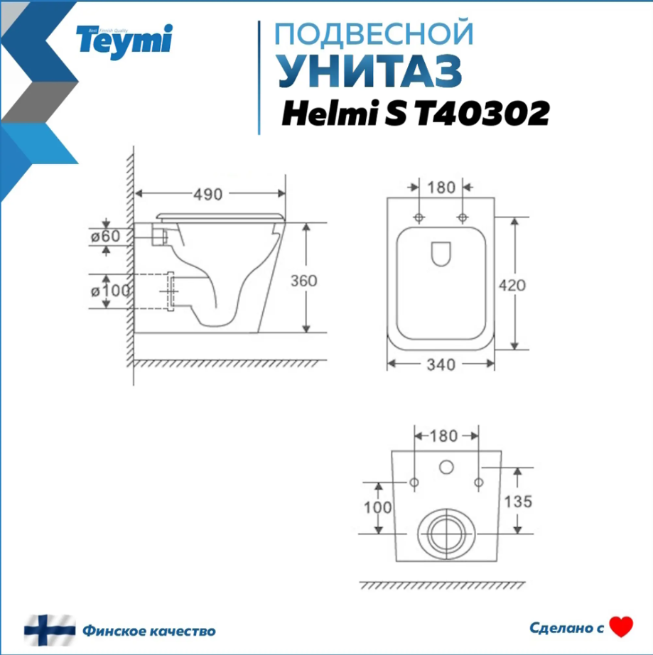 Унитаз подвесной безободковый Teymi Helmi S T40302. Комплектуется ультратонким быстросъёмным сиденьем, изготовленным из прочного, устойчивого к царапинам материала - дюропласта.