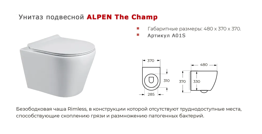 - Подвесной унитаз ALPEN Continental A01S - модель с грязеотталкивающим покрытием керамики отличается белизной, отсутствием пор и углублений, что делает сантехнику стойкой к загрязнениям и образованию известкового налёта. Покрытие устойчиво к истиранию и воздействию химических веществ. Полностью безободковая чаша без скрытых труднодоступных мест, где может скапливаться грязь. Такая система делает уборку санузла быстрее и проще, а также помогает предотвратить появление посторонних запахов. Унитаз с мощным каскадным смывом. Конструкция чаши унитаза позволяет избежать попадание брызг воды при использовании. Жёсткая крышка-сиденье из дюропласта, быстросъёмная, с механизмом Soft Close (плавное опускание) рассчитана не менее чем на 200 000 циклов опускания и закрывания.