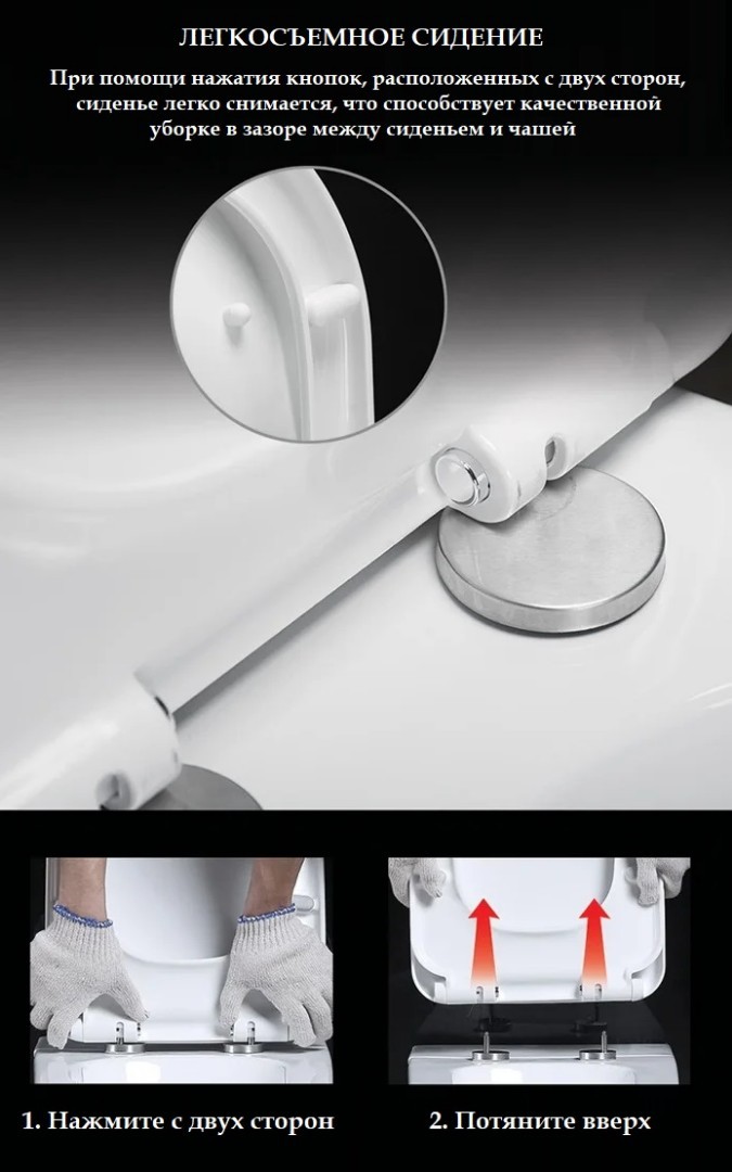 - В комплекте присутствует легкосъёмное сидение с крышкой, оснащённое системой микролифт (для плавного и бесшумного опускания). Крепления к чаше выполнены из стали, а само сидение - из долговечного полимерного материала – дюропласта с антибактериальным покрытием. Снятие осуществляется одним нажатием кнопки.