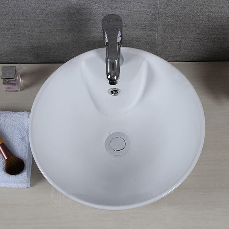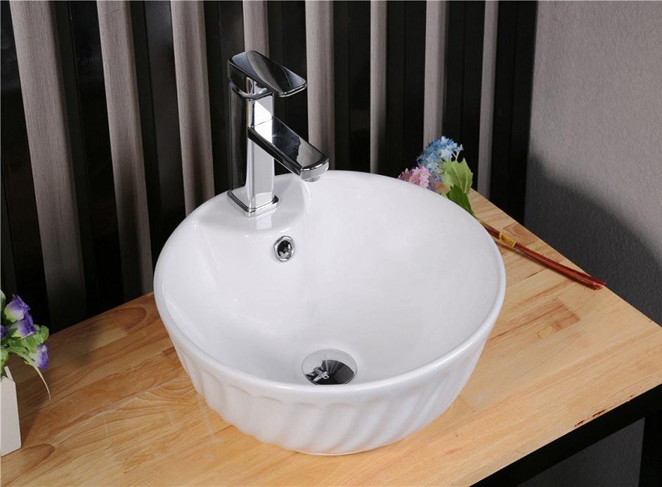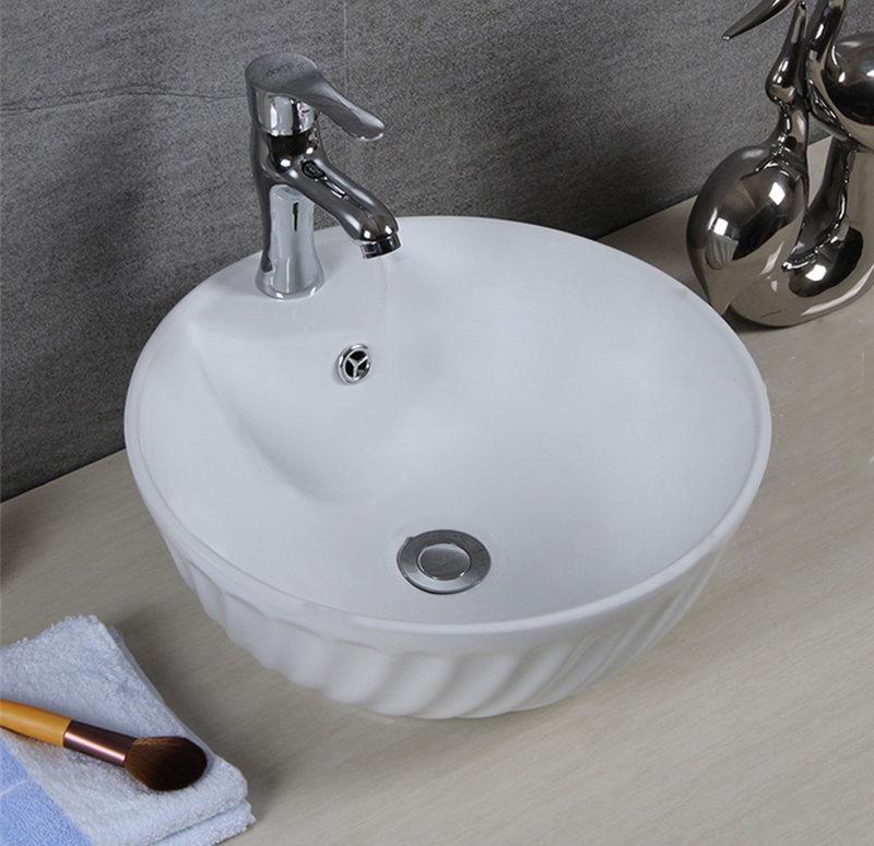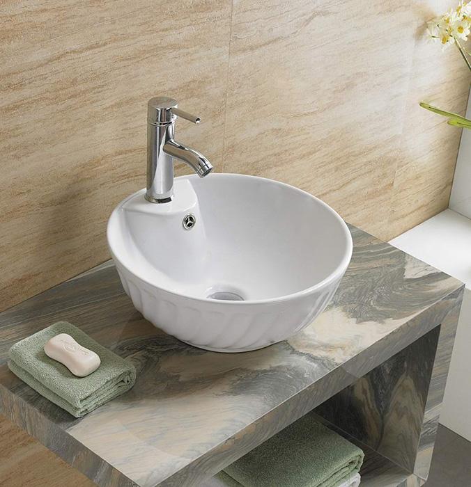 Белая круглая накладная раковина для ванной на столешницу. С отверстием для смесителя, с переливом. Выпуск (донный клапан) и сифон в комплектацию не входят, приобретаются отдельно. Диаметр слива - 45 мм.