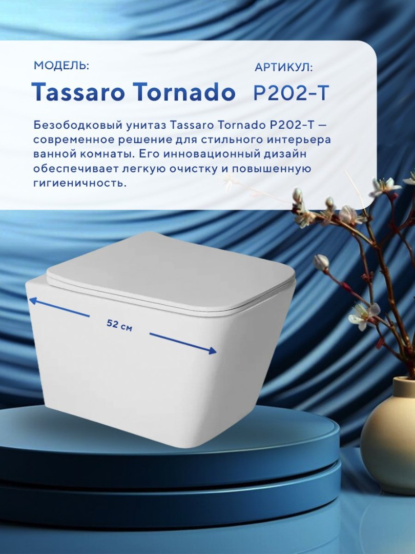Безободковый унитаз Tassaro Tornado P202-T - это современное решение для стильного интерьера ванной комнаты. Его инновационный дизайн обеспечивает лёгкую очистку и повышенную гигиеничность.