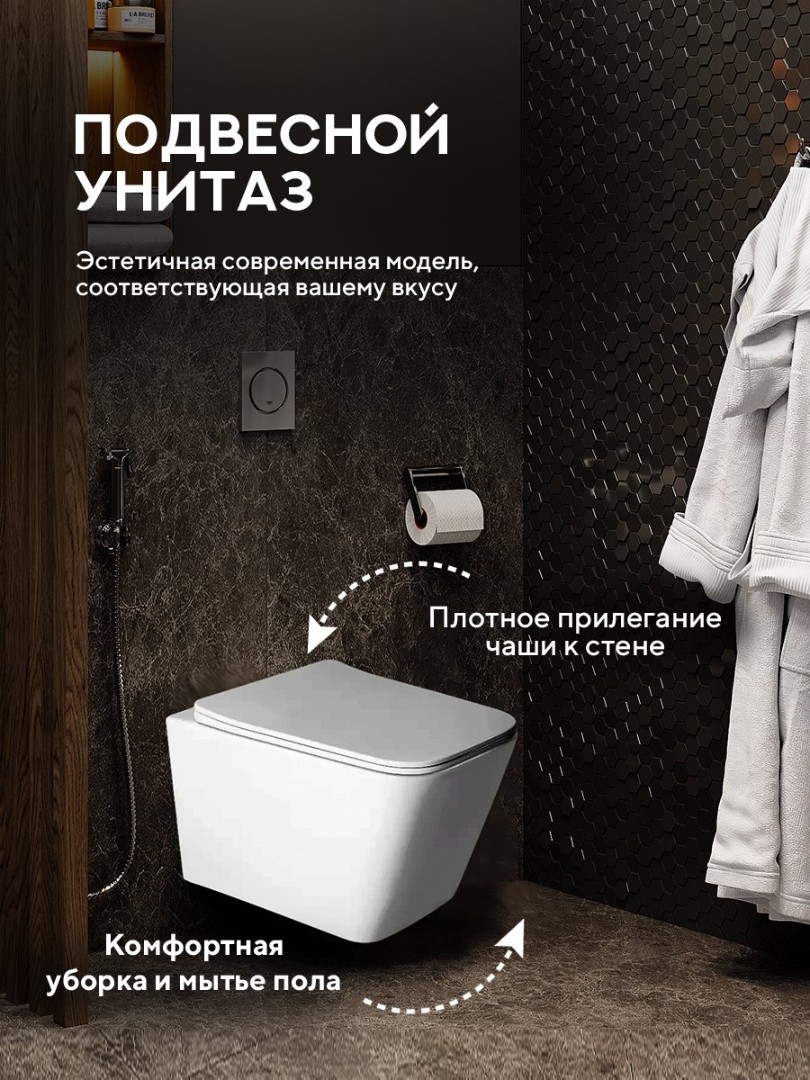 - Безободковая конструкция препятствует скоплению бактерий и грибков, обеспечивает 100% качественное смывание, не требует моющих средств, экономит воду и бытовую химию;
