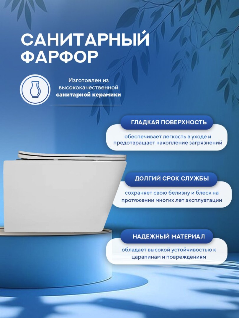 - Покрытие BioSafe. Унитаз выполнен по безободковой технологии с антибактериальной защитой BioSafe, что делает его на 95% более гигиеничным;