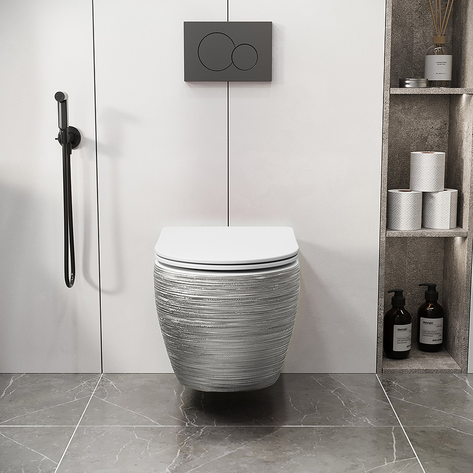 Подвесной унитаз. Размер: 550х365х395 мм. Цвет серебро с белым.