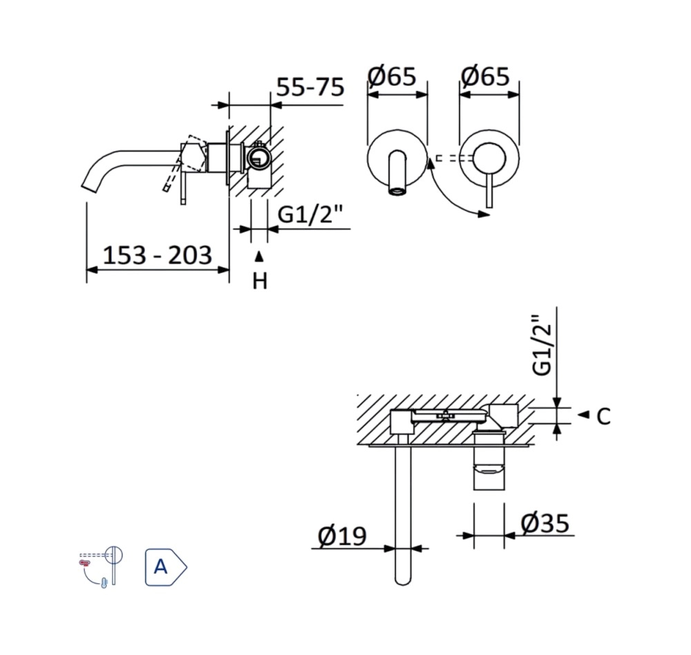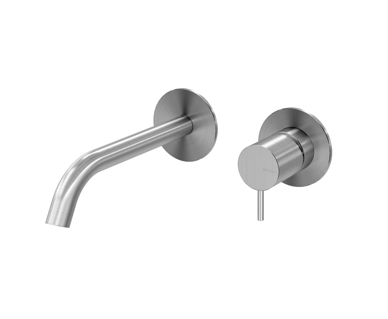 Внешняя часть смесителя для раковины на 2 отверстия, настенный. Длина излива 150 мм X-Alpha E186 850 2IS Satin Stainless Steel (скрытая часть 200 100 2NO приобретается отдельно).