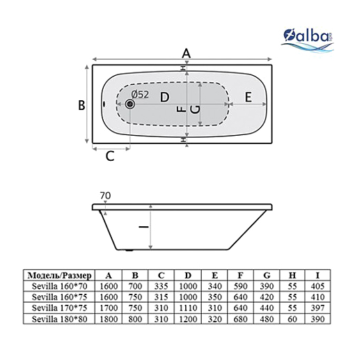 Акриловая ванна Alba Spa Sevilla 160х75