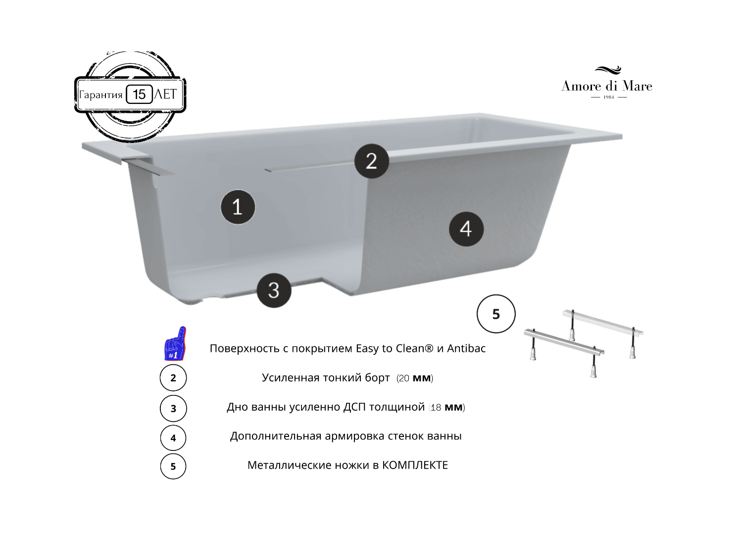 Акриловая ванна Amore di Mare MIRO с технологией ADMThermo&AntiNoise отличается идеальной геометрией и безупречной белизной поверхности. Тонкий борт ванны усилен металлической балкой, а в основании использован лист ДСП толщиной 18 мм. Поверхность обладает антибактериальными свойствами и легко очищается от загрязнений. Технология ADMThermo дольше сохраняет температуру, делая купание максимально комфортным. Система AntiNoise позволяет значительно снизить уровень шума. В комплекте ножки, регулируемые по высоте 120-170 мм.