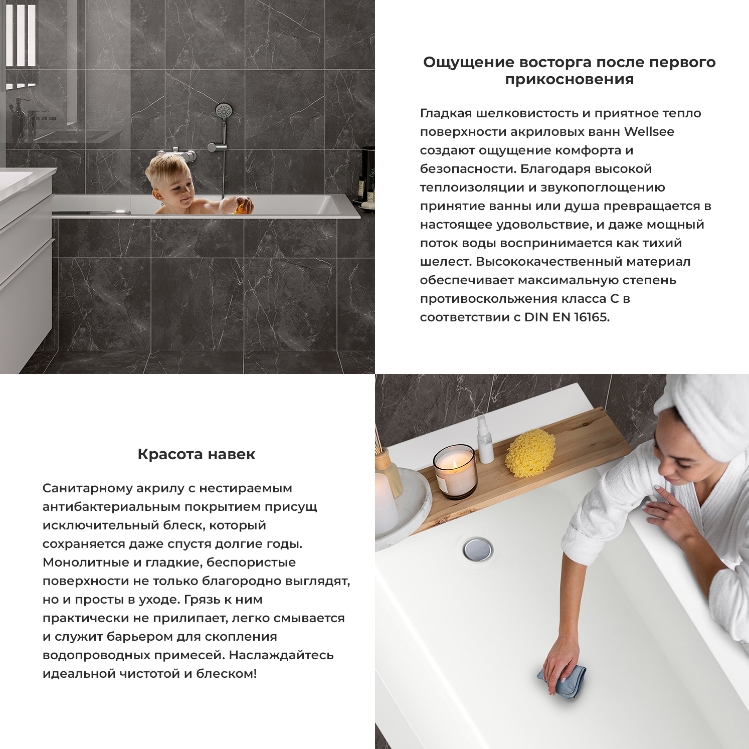 Встраиваемая ванна Wellsee 165 см с увеличенной шириной чаши 80 см. Прямоугольная купель предусматривает как пристенную установку на регулируемые по высоте опоры, так и встраиваемый монтаж в нишу с последующей облицовкой плиткой или же специальные подиумы. Широкий бортик по периметру допускает врезку смесителя и удобное размещение предметов гигиены. Скошенная спинка обеспечивает удобное погружение в купель при меньшем объеме воды, а боковое размещение стока – максимальный комфорт