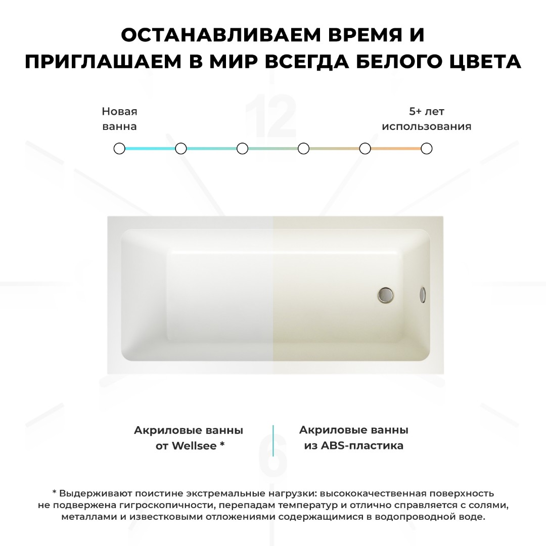 Встраиваемая ванна Wellsee 150 см с увеличенной шириной чаши 80 см. Прямоугольная купель предусматривает как пристенную установку на регулируемые по высоте опоры, так и встраиваемый монтаж в нишу с последующей облицовкой плиткой или же специальные подиумы. Широкий бортик по периметру допускает врезку смесителя и удобное размещение предметов гигиены. Скошенная спинка обеспечивает удобное погружение в купель при меньшем объёме воды, а боковое размещение стока – максимальный комфорт