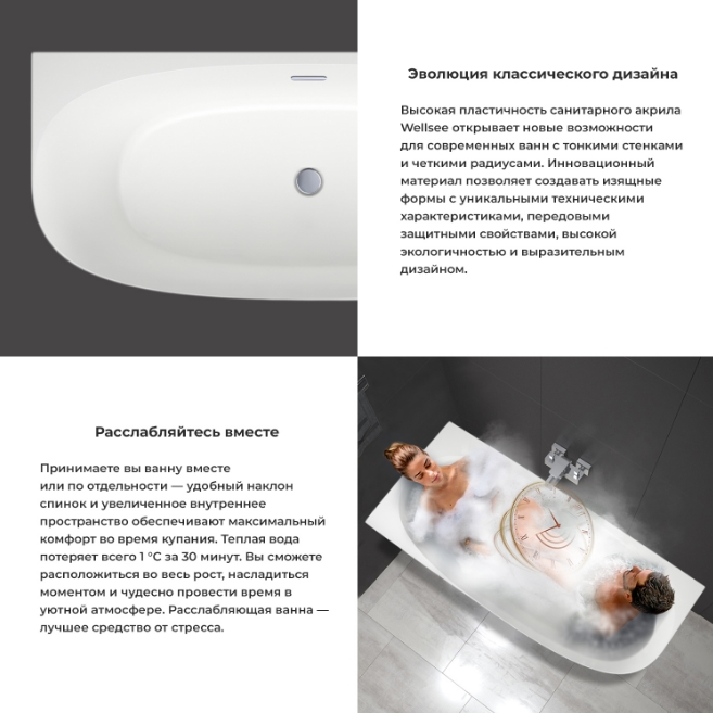 Пристенная акриловая ванна в наборе 4 в 1 Wellsee Belle Spa 2.0 235803004, 160*75 с правым разворотом для углового монтажа, так и в универсальном исполнении. Несъемная цельнолитая панель скроет инженерные коммуникации и защитит от попадания мелких предметов под ванну. Изящный тонкий бортик в сочетании с широкими углами ванны, где можно также расположить предметы гигиены, подчеркивает легкость и оригинальность конструкции. Купель с малыми радиусами скруглений имеет плавный наклон стенок, обеспечивающий равномерную поддержку спины для полного комфорта и расслабления.