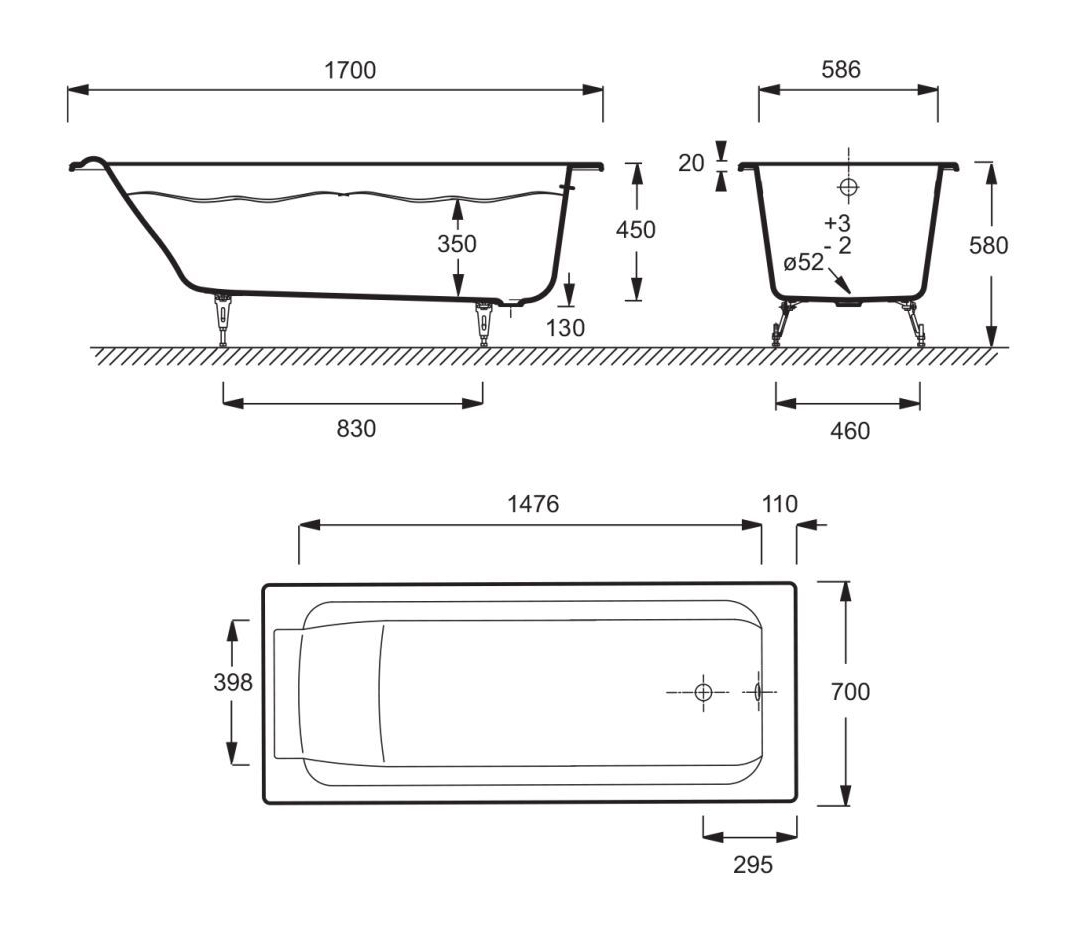 Ванна чугунная 170x70 Jacob Delafon Parallel E2947-00, без ручек.