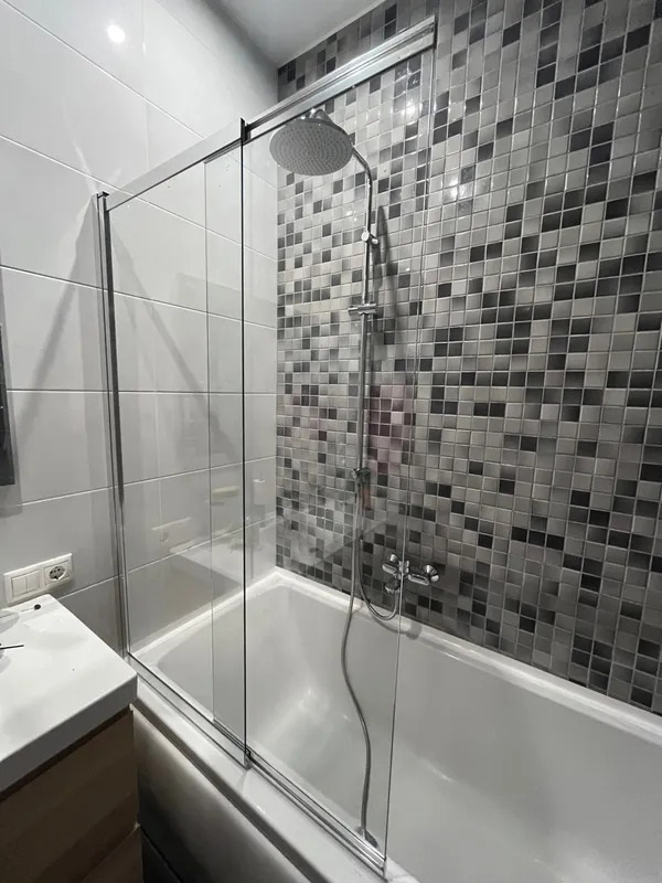 Шторка состоит из двух полотен, которые можно сложить друг к другу и затем всё изделие повернуть к стене. Стекло закалённое, ударопрочное, обработка easy clean (лёгкий уход).