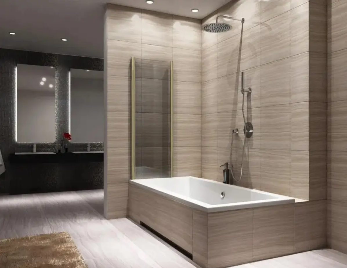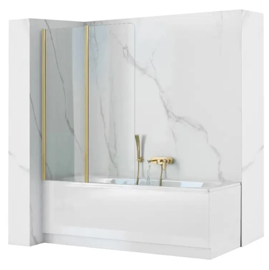 Шторка для ванны позволит превратить ванну в душевую кабину, предохраняя ванную от брызг и улучшая ее визуальные свойства. Алюминиевые профили в матовом золоте сделают ванну элегантной. Шторку можно сложить к стене, благодаря чему она будет занимать очень мало места.