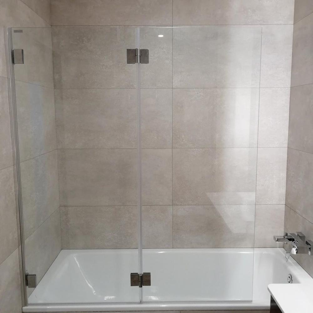 Двустворчатая стеклянная шторка для ванны, складывается посередине только внутрь ванны.
