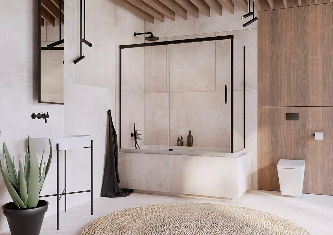Фронтальная душевая шторка на ванну с одной сдвижной дверью и одной неподвижной стенкой. Дополнительно укомплектована боковой стенкой для получения Г-образной формы. Возможна правосторонняя и левосторонняя установка.