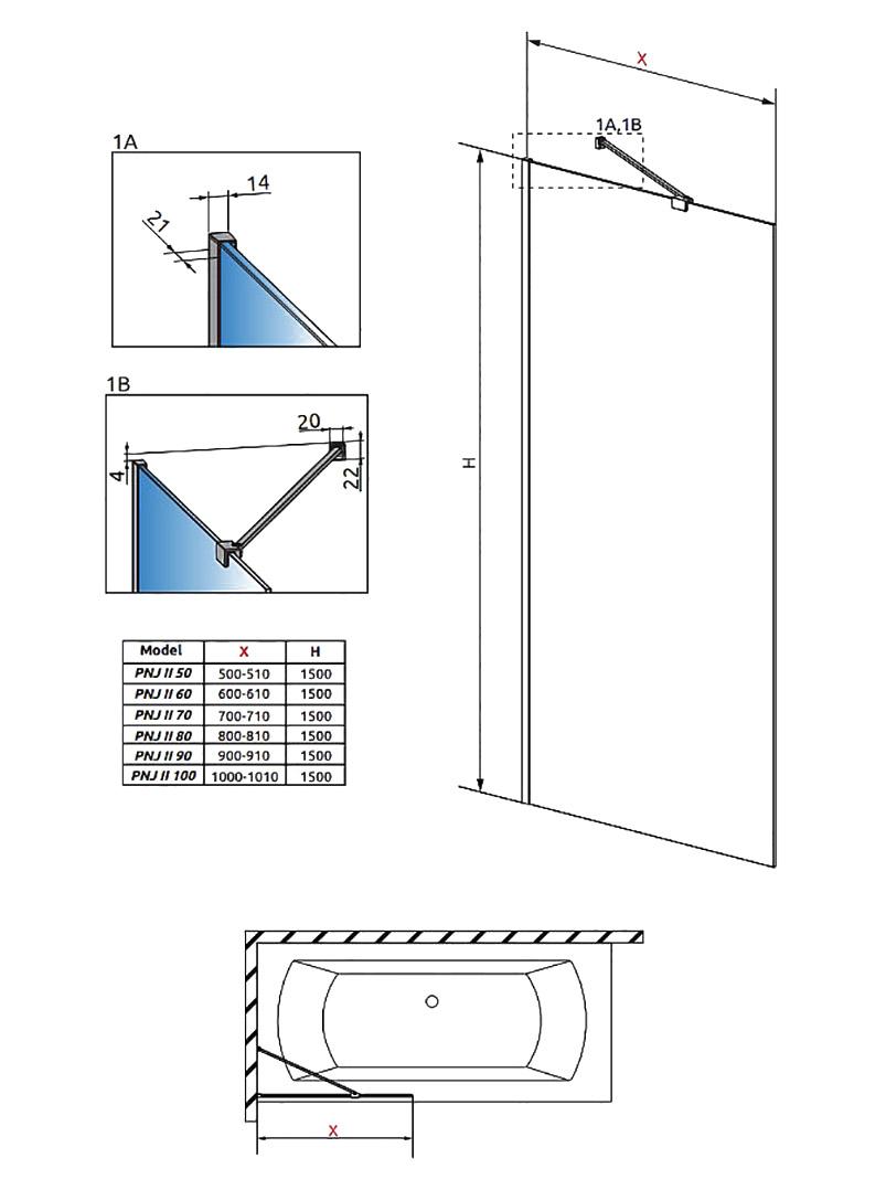 - Стекло крепится к стене с помощью пристенного профиля с регулировкой в случае отклонения от вертикали до 10 мм.