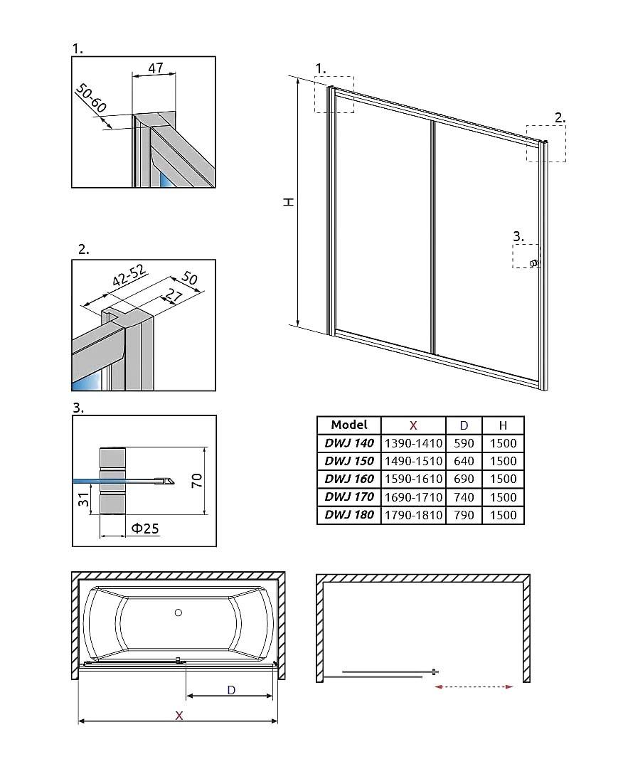 Модель Vesta DWJ - это фронтальная душевая шторка на ванну с одной сдвижной дверью и одной неподвижной стенкой. Дополнительно можно комплектовать боковой стенкой (65, 70, 75, 80 см) для получения Г-образной угловой шторки на ванну. Возможность правосторонней и левосторонней установки.