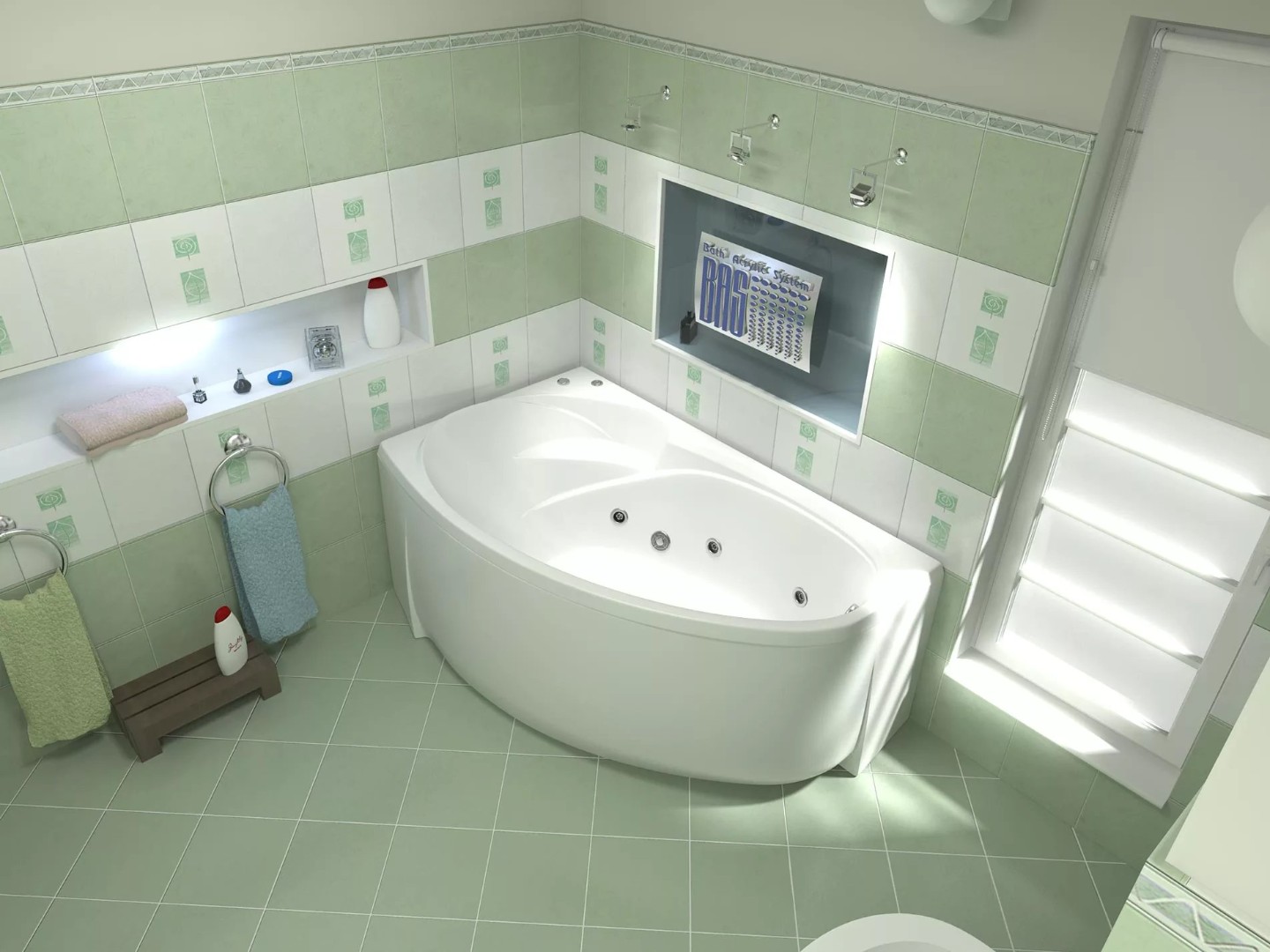 Акриловая асимметричная ванна в комплекте с каркасом. Гидромассаж включает в себя 6 плоских форсунок.