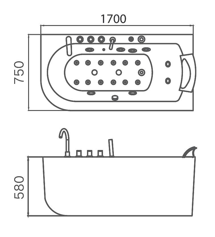 Ванна Gemy G9261-1.7 R 170х75 см оснащена несколькими видами гидромассажа и основных функций: