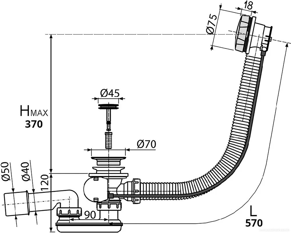 - Назначение сифона: для ванны