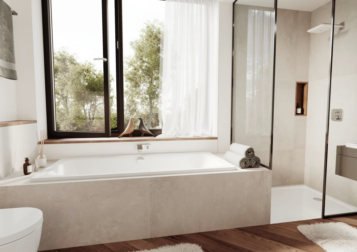 - современная прямоугольная ванна с прямыми линиями и маленькими радиусами;