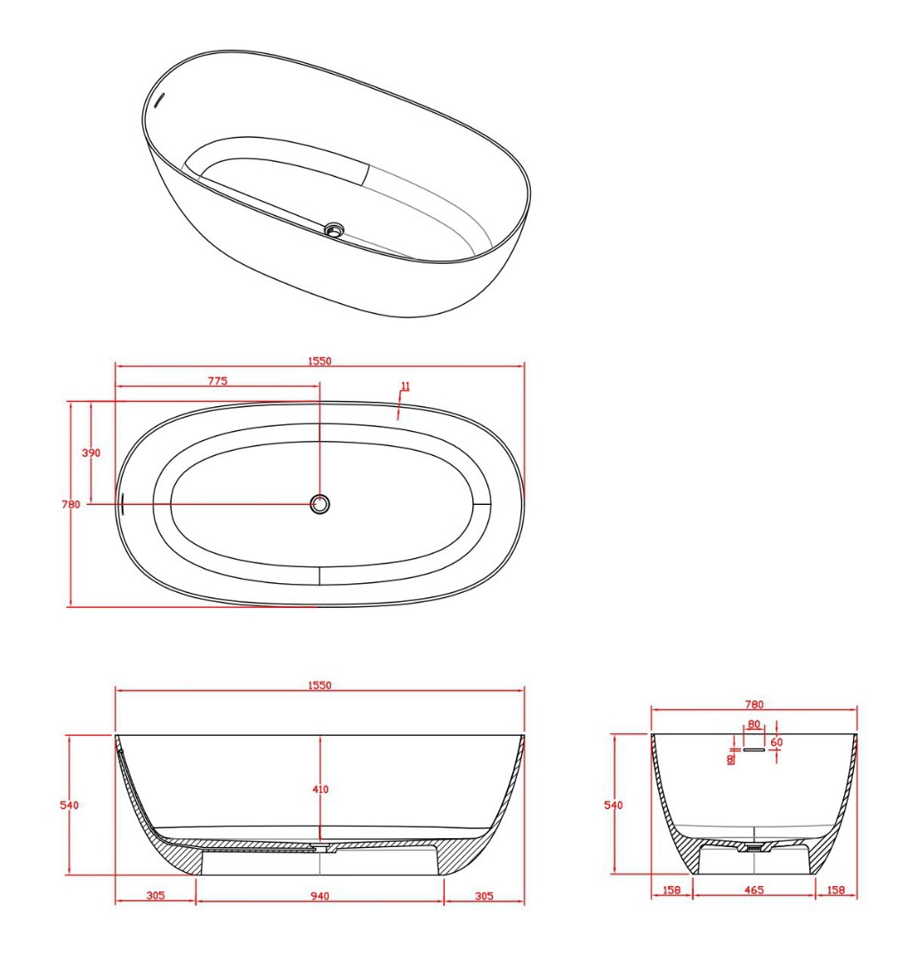 Ванна из искусственного камня Timo solid SATU1555 155x78 белый матовый