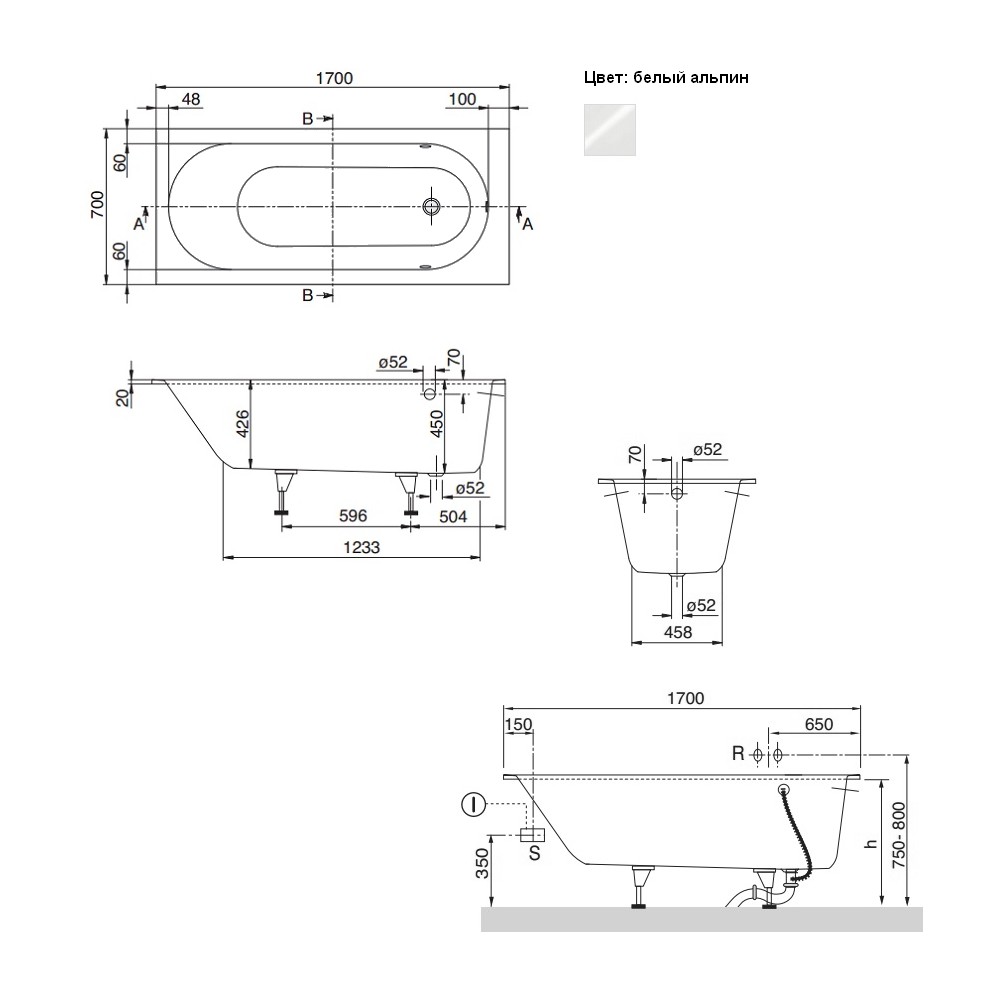 Квариловая ванна Villeroy&Boch Oberon 170x70, с ножками