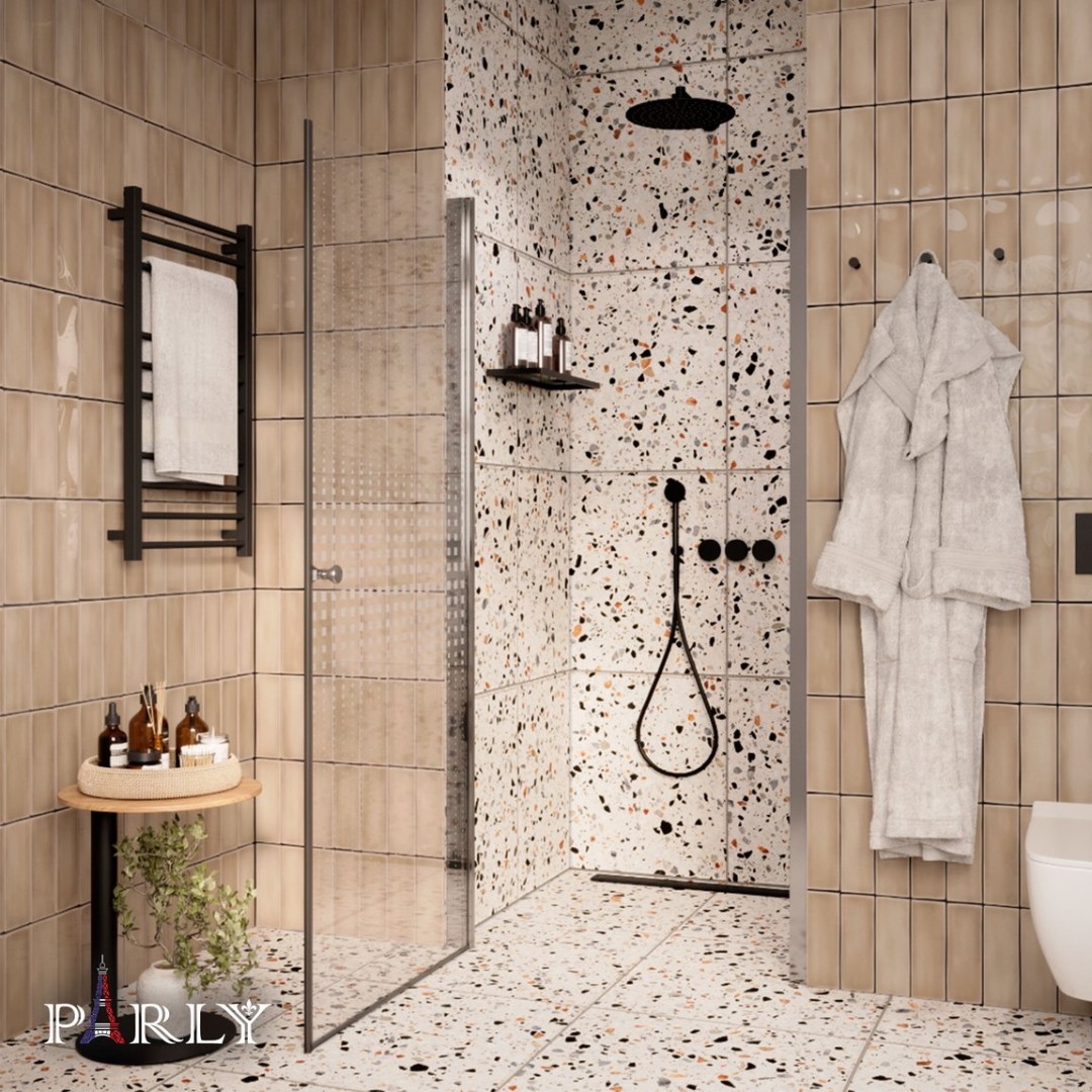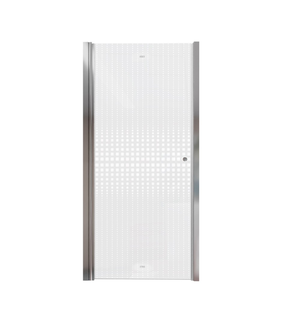 Модель из прозрачного закалённого стекла (5 мм) с дизайнерским рисунком. Полотно из закалённого стекла устойчиво к случайным ударам. В случае битья, стекло рассыпается на множество мелких граней с тупыми концами. Дверь открывается только в одну сторону. Имеет уплотнители под углом 45 градусов.