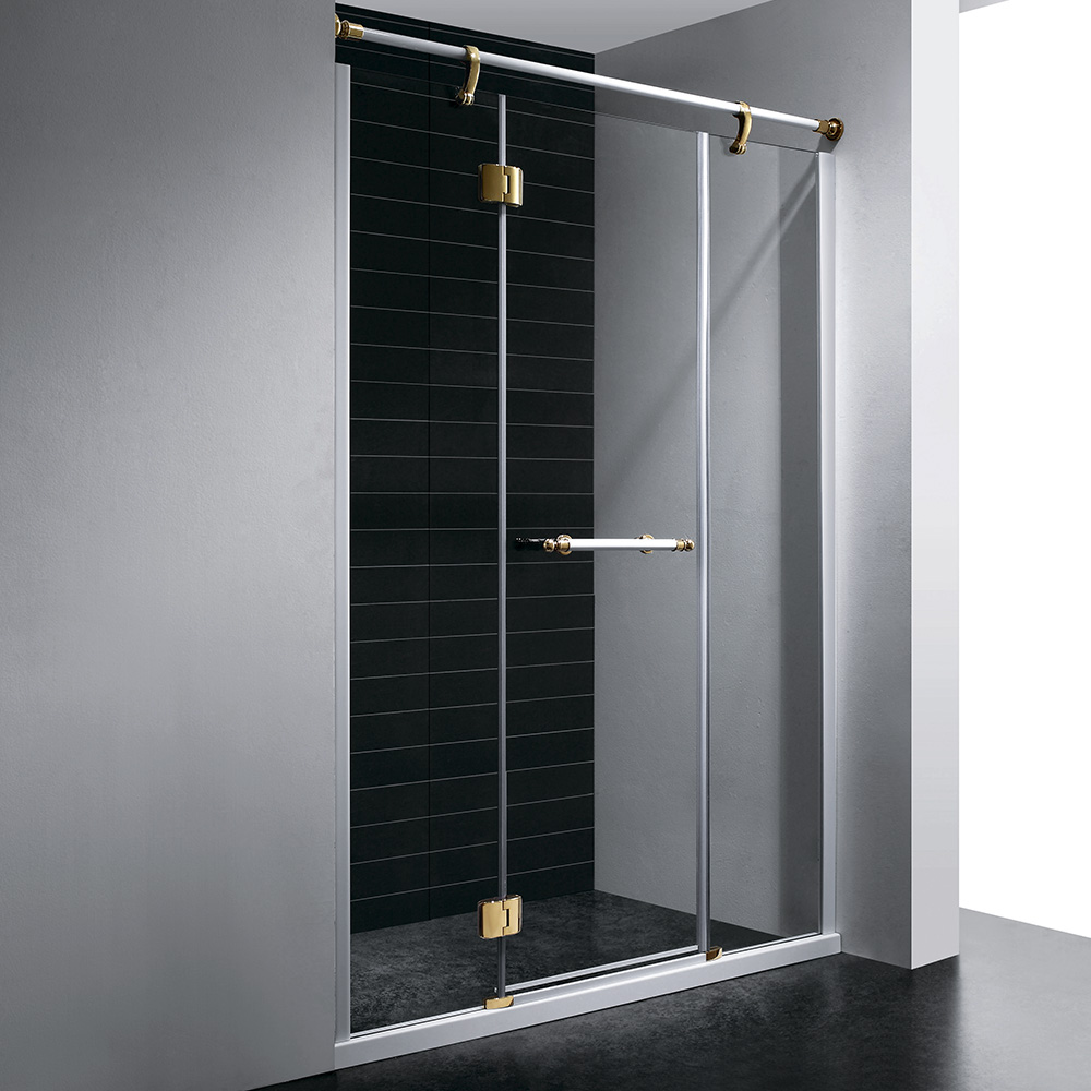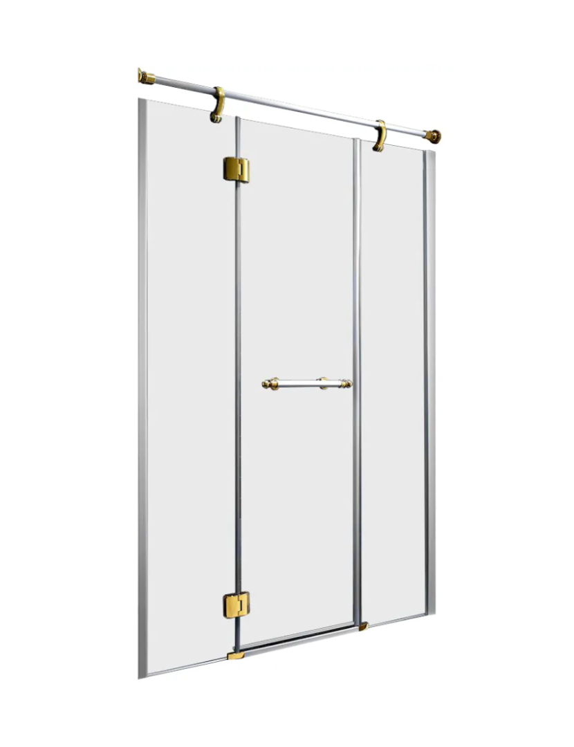 Трёхсекционное ограждение состоит из двух боковых неподвижных частей и распашной двери, расположенной посередине. Дверь крепится на петлях к неподвижной стенке и открывается от центра. Профиль, верхний кронштейн и ручка - белые, с элементами золотого цвета. В комплекте нижняя пороговая планка. Универсальная установка L/R.