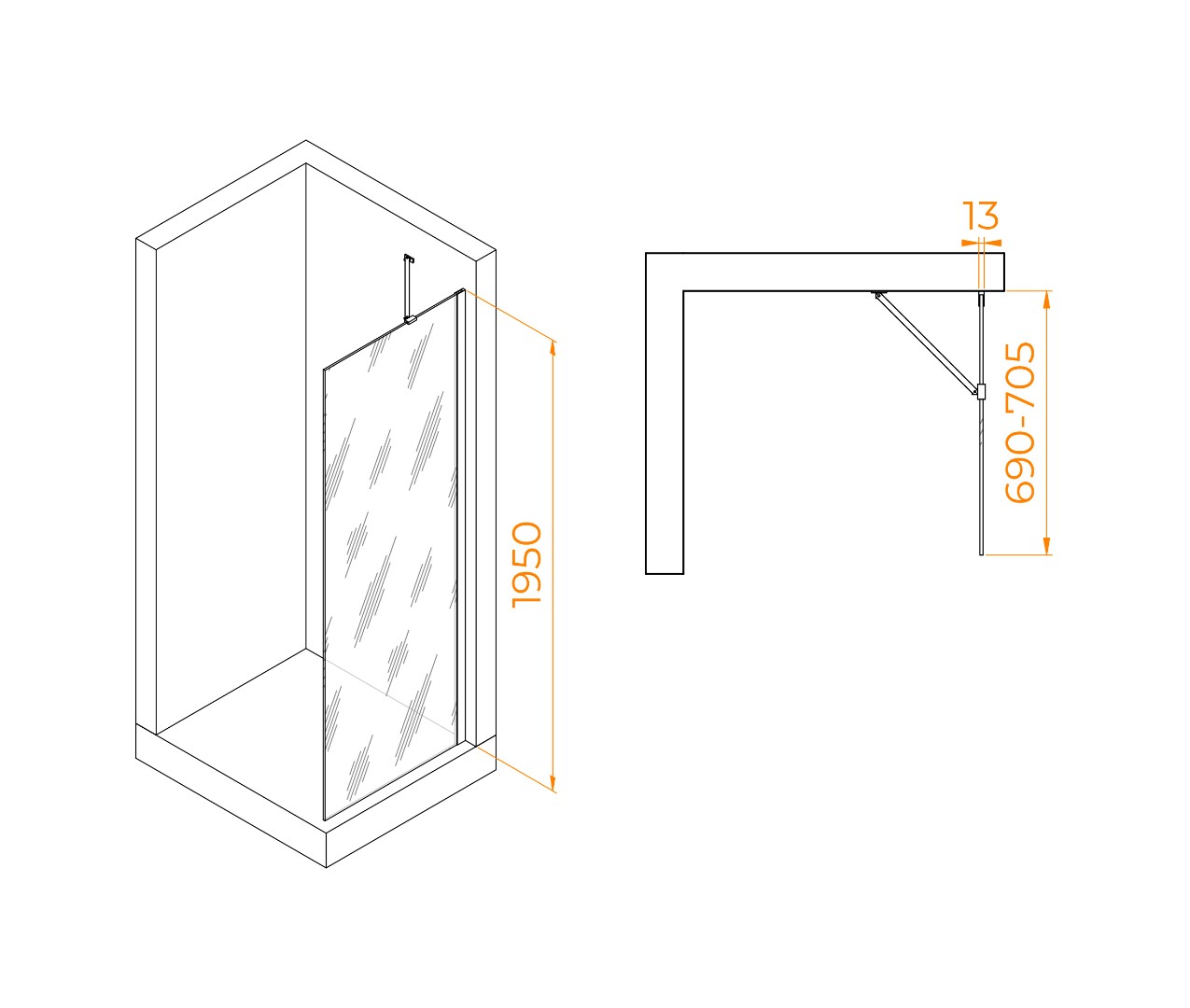 Высота перегородки составляет 195 см, что позволяет использовать её в различных типах помещений. Благодаря классу герметичности 3, зона душа остается сухой и защищённой от воды, что является очень важным для комфортного использования.
