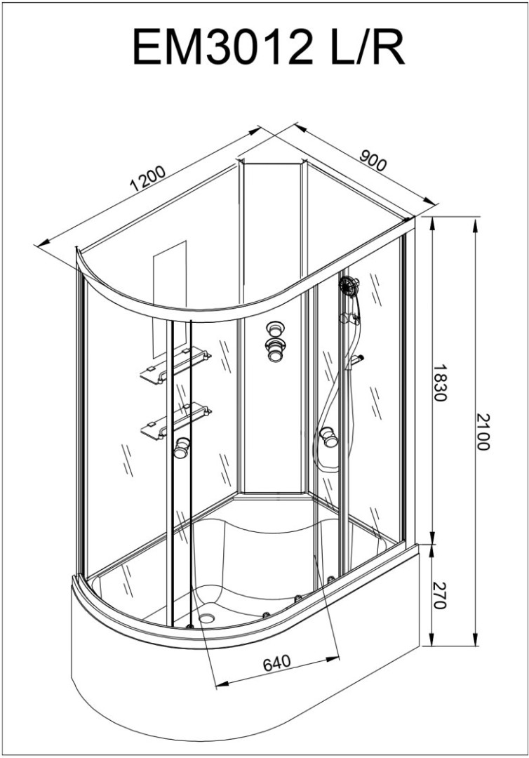 Стильная душевая кабина AvaCan EM3012 сочетает в себе высокую функциональность, практичность и надёжность. Для изготовления применяют безопасное закалённое стекло толщиной 5 мм, надёжно фиксируемое алюминиевым профилем. Цвет профиля хром.